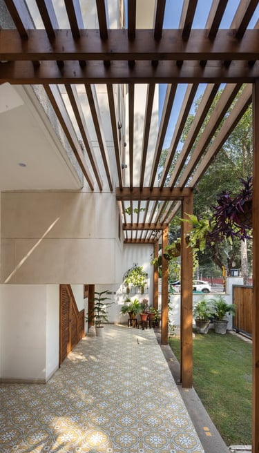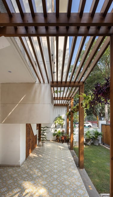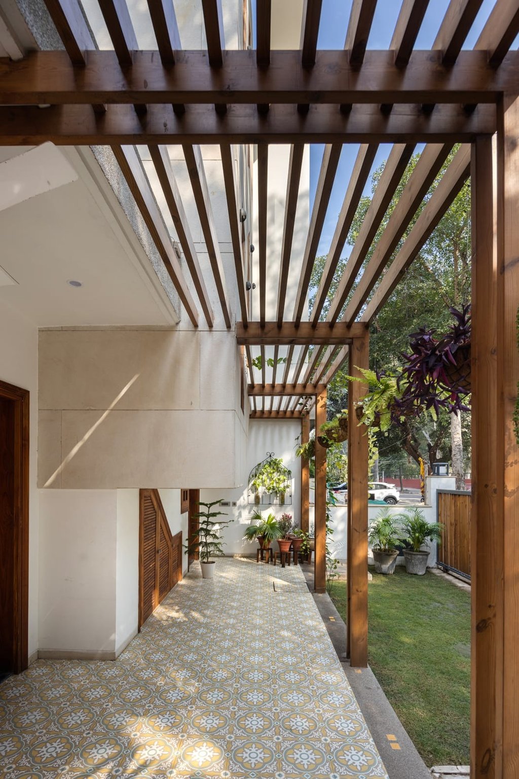 Wooden pergolas add texture and play with light, seamlessly merging the indoors with nature.