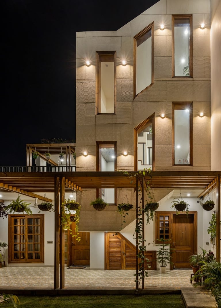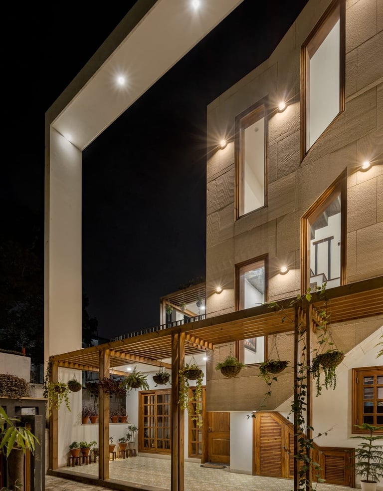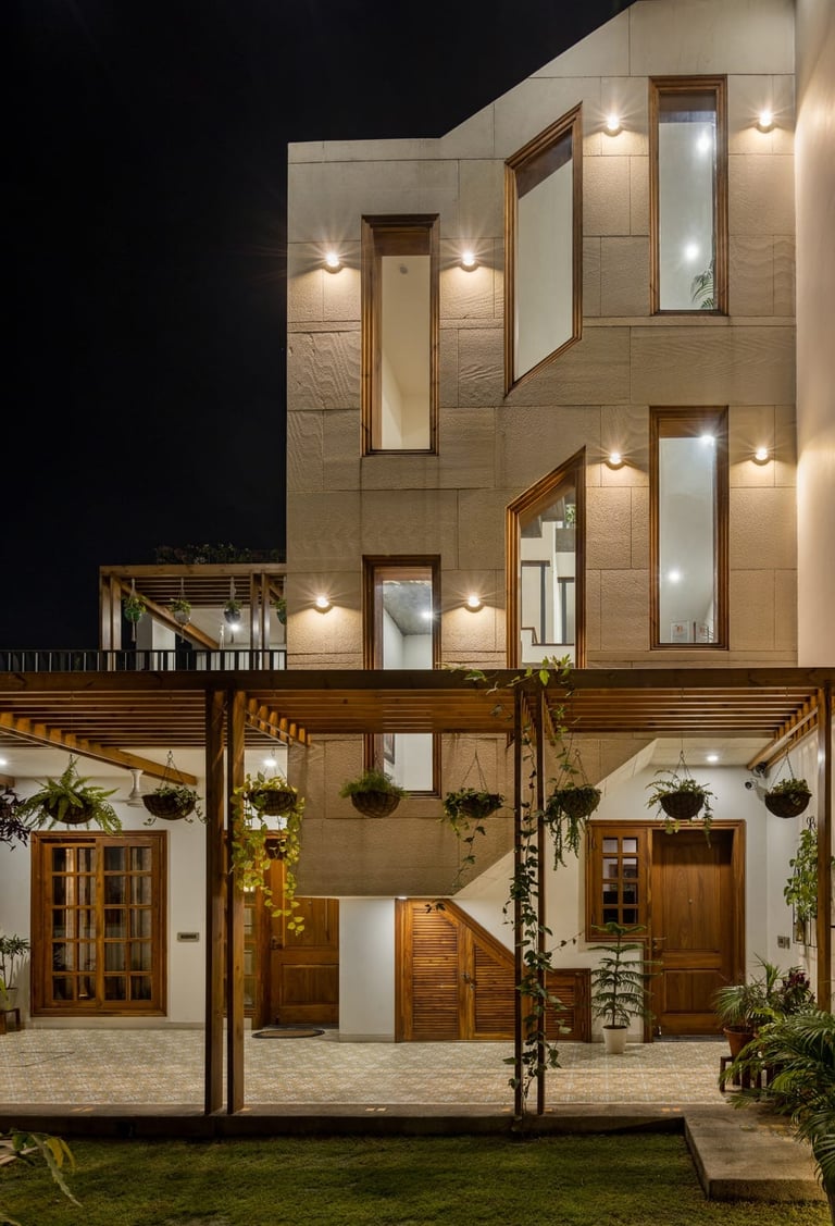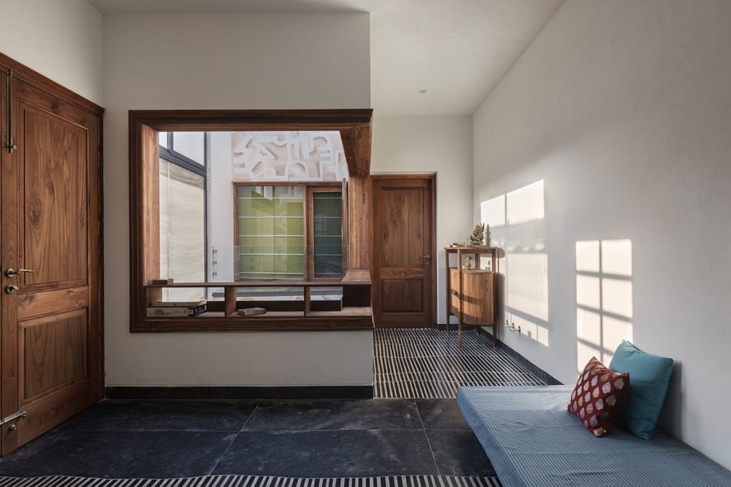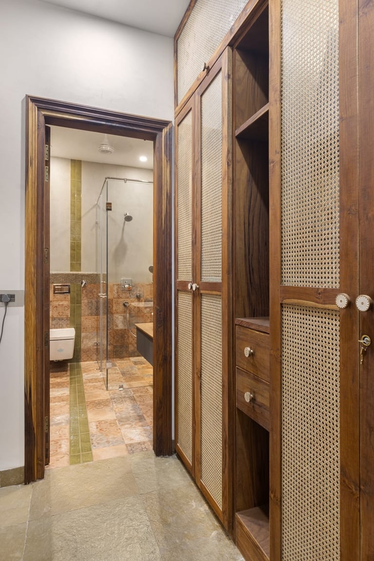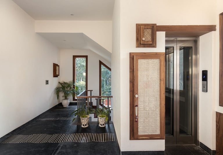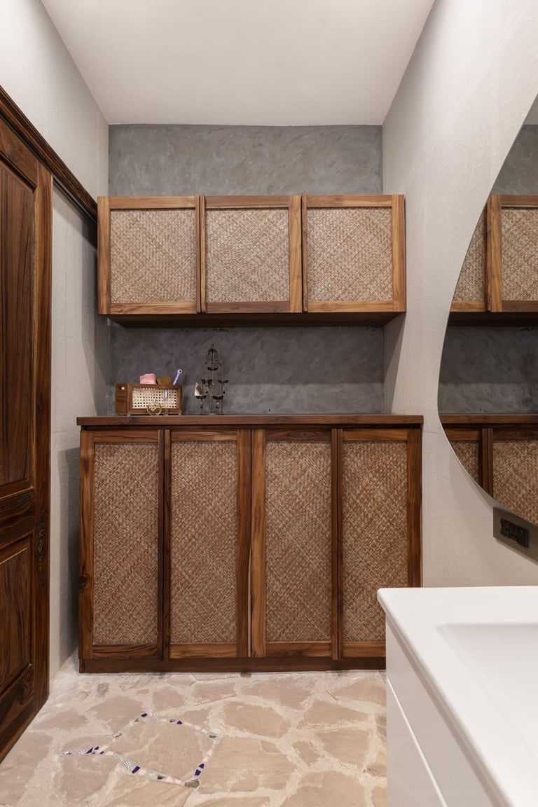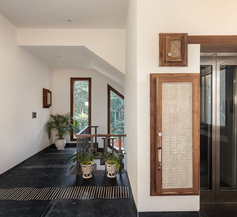 Designed as a serene retreat for septuagenarians, the home embraces earthy materials like wood, stone, jute and rattan, offering warmth and timeless elegance.