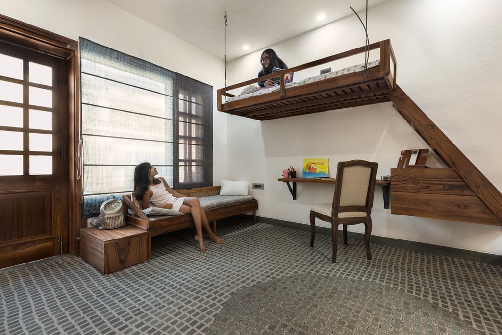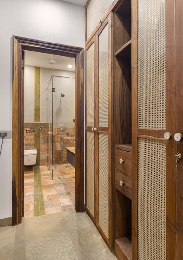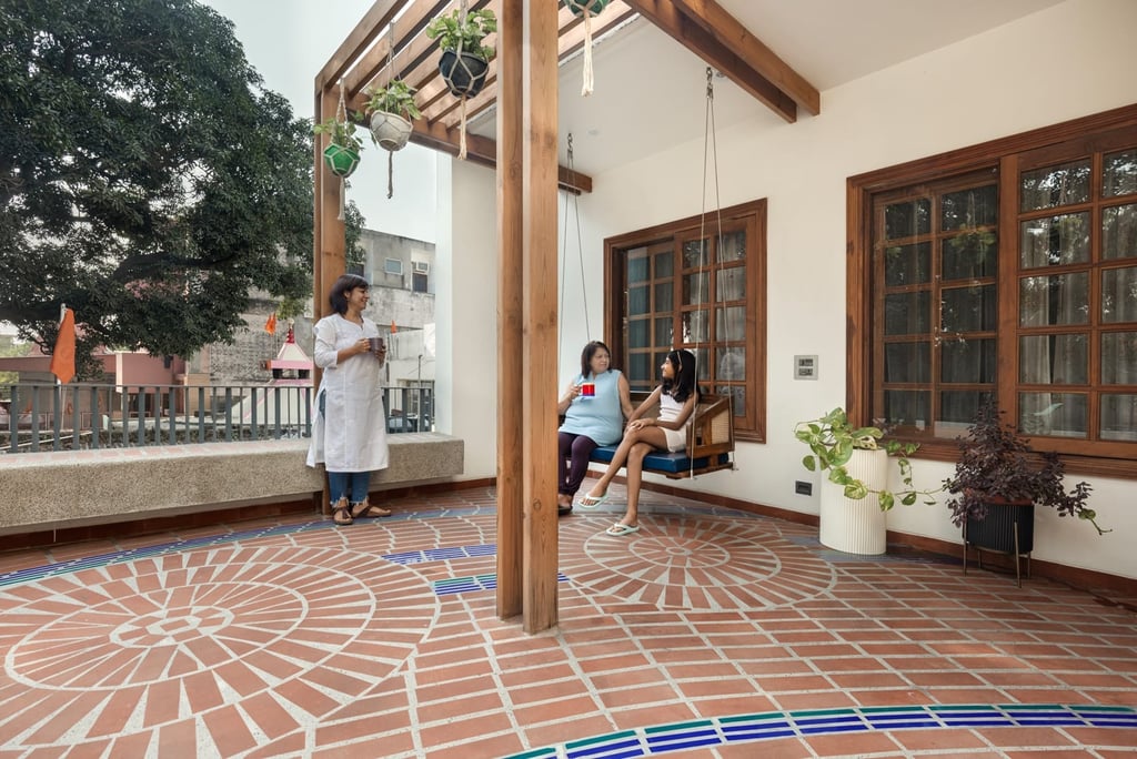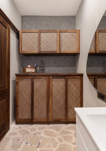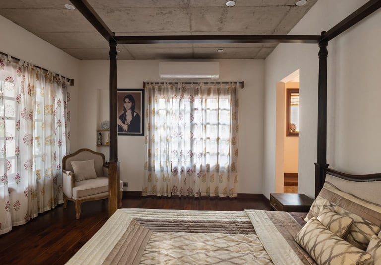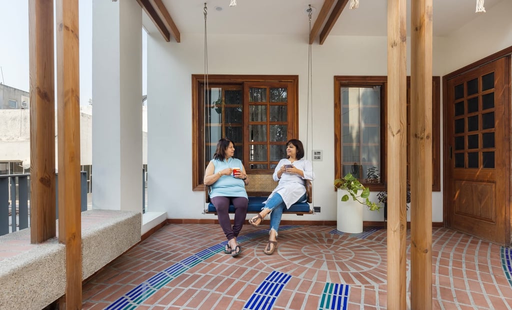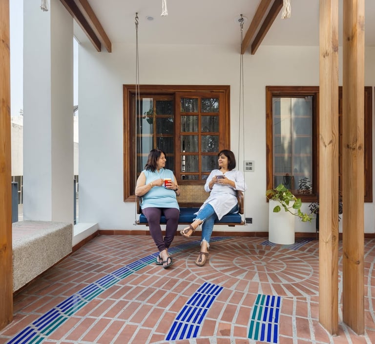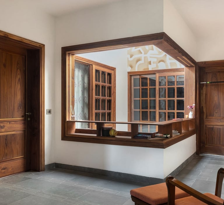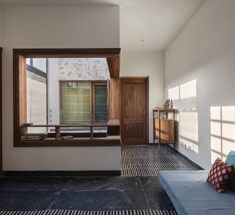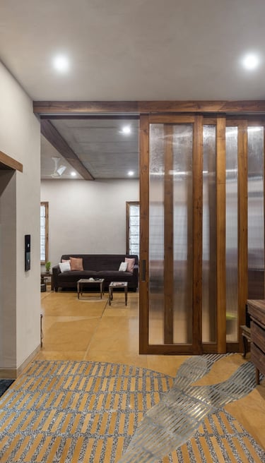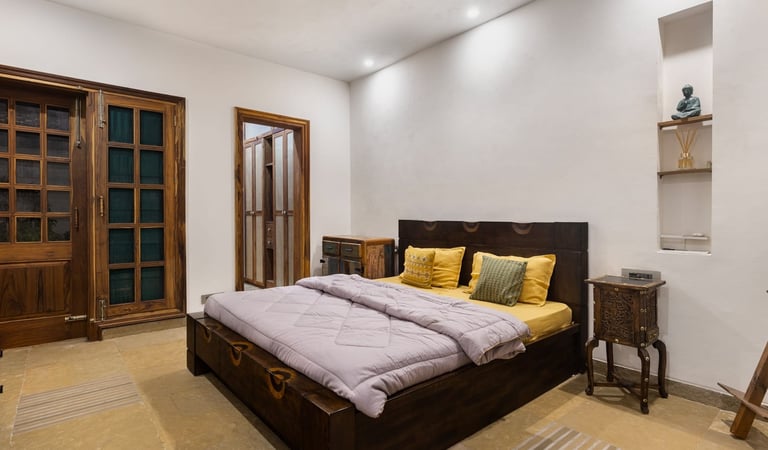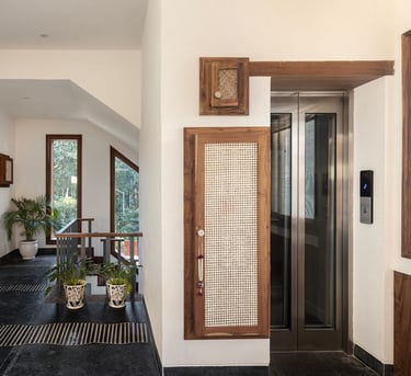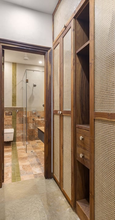 Designed as a serene retreat for septuagenarians, the home embraces earthy materials like wood, stone, jute and rattan, offering warmth and timeless elegance.