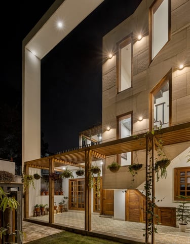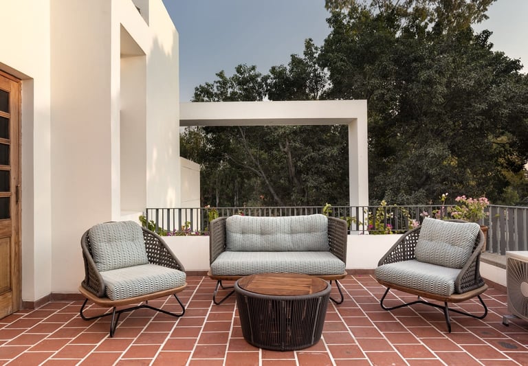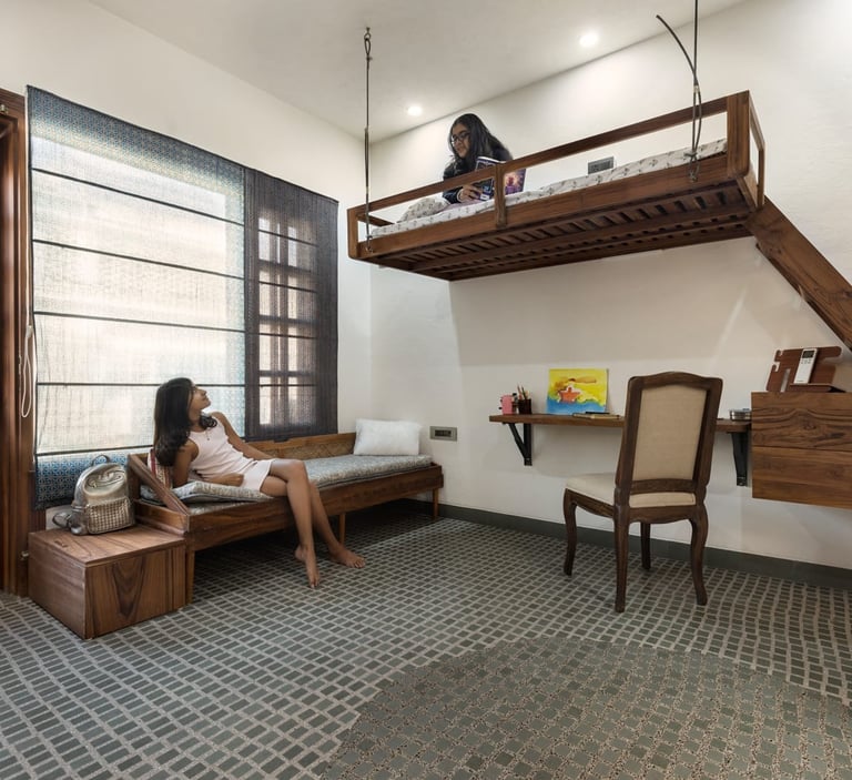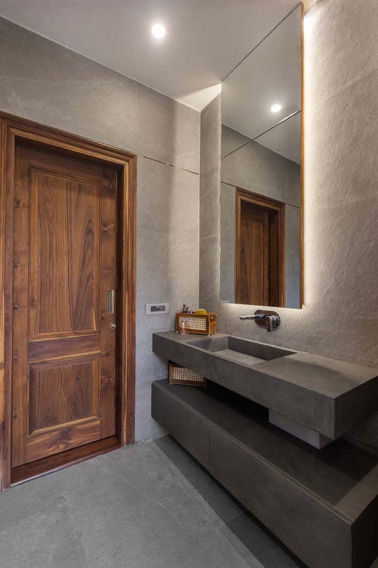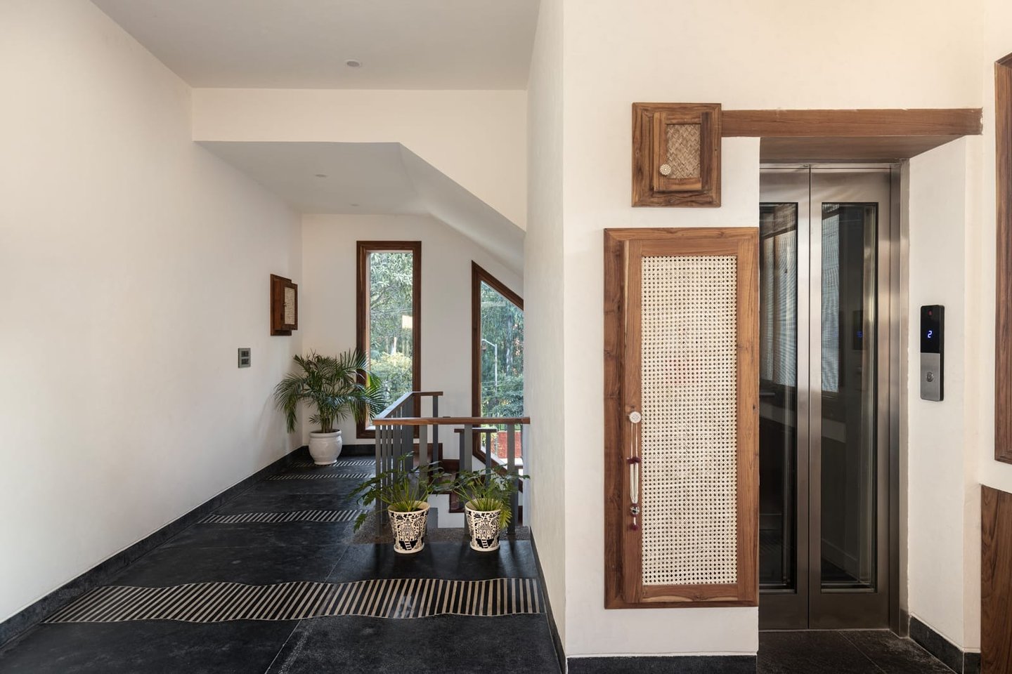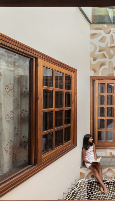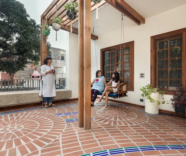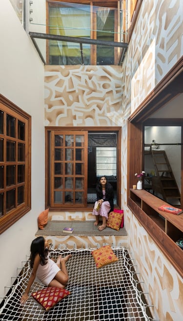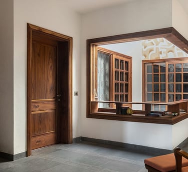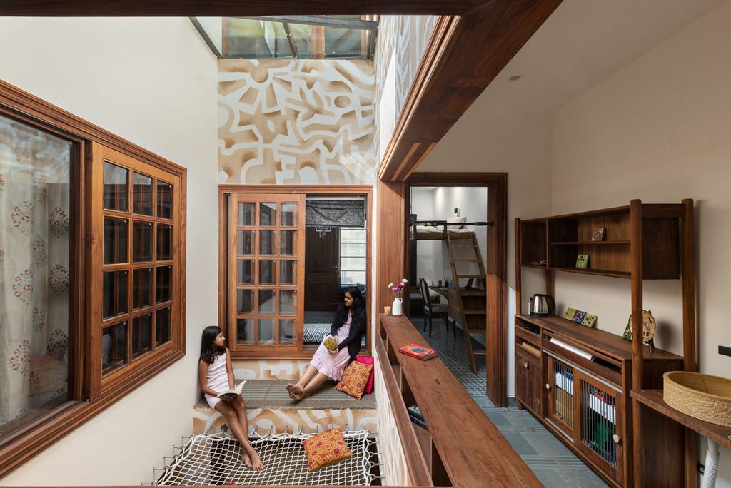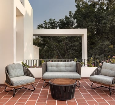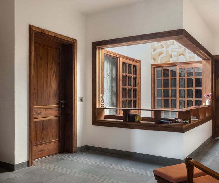 Designed as a serene retreat for septuagenarians, the home embraces earthy materials like wood, stone, jute and rattan, offering warmth and timeless elegance.