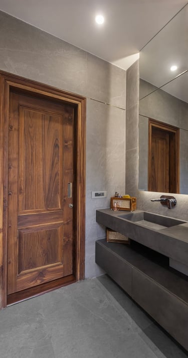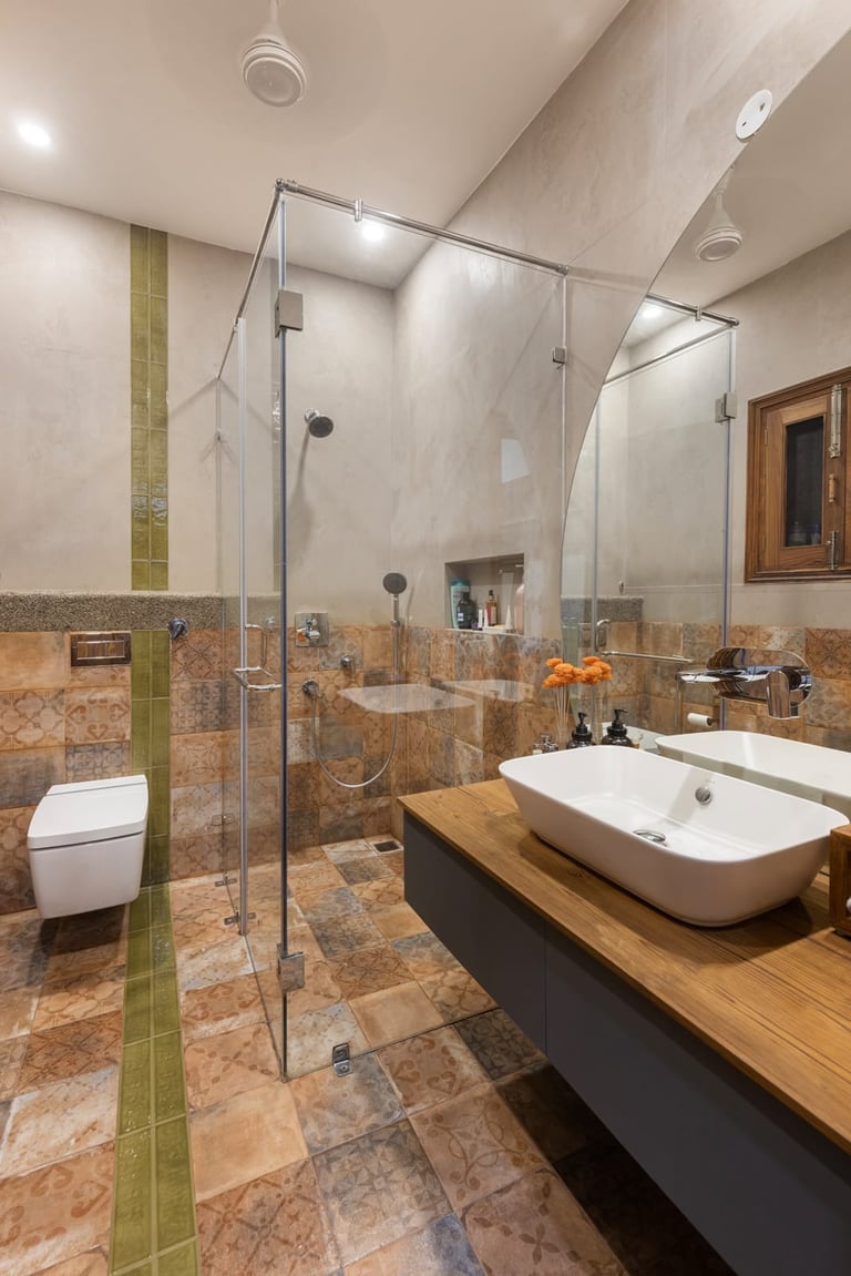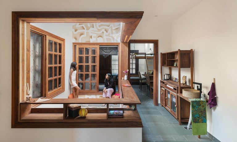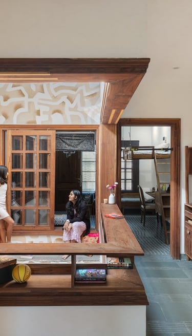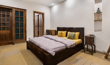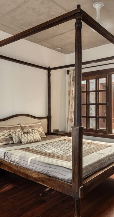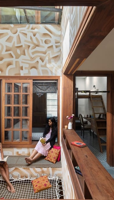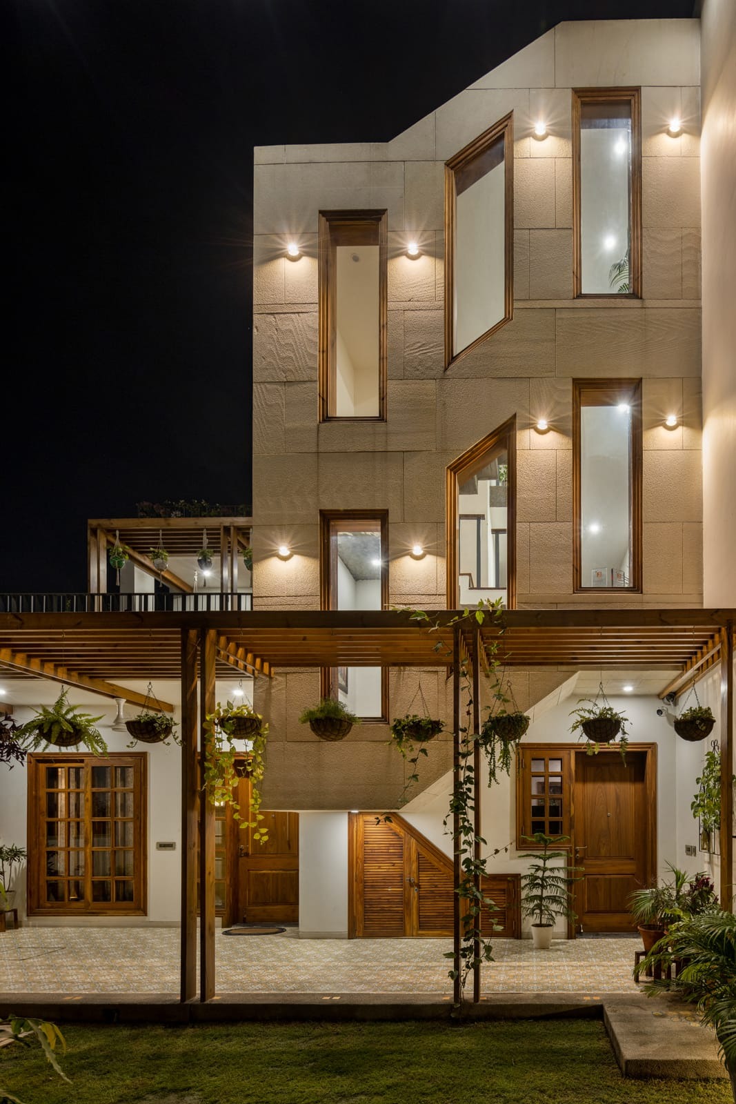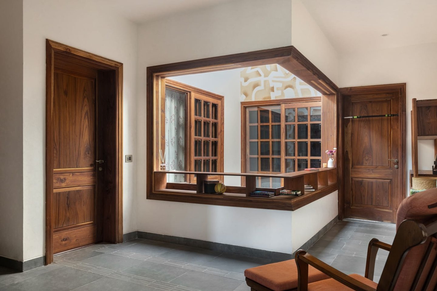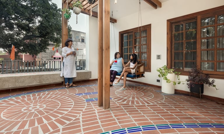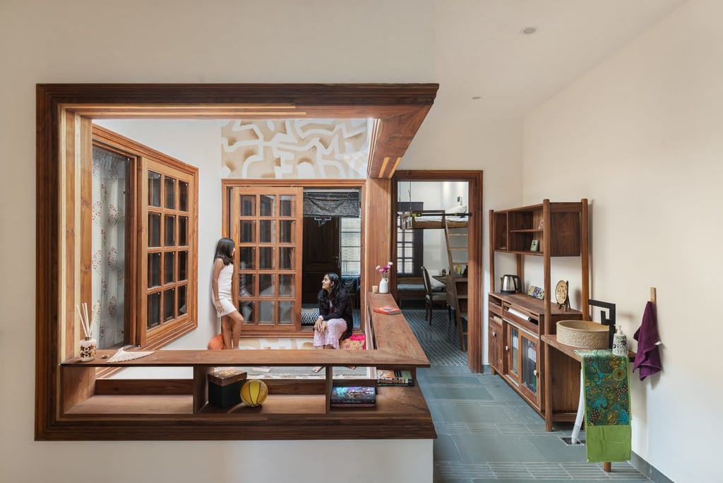 Designed as a serene retreat for septuagenarians, the home embraces earthy materials like wood, stone, jute and rattan, offering warmth and timeless elegance.