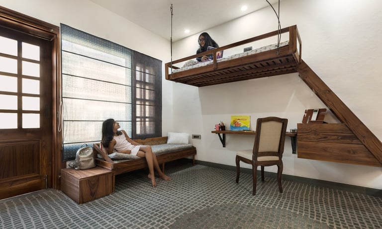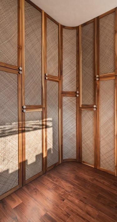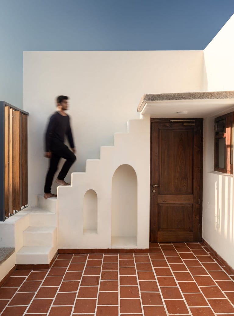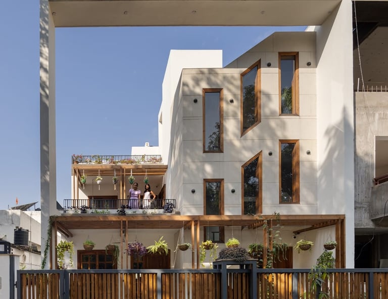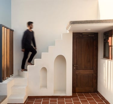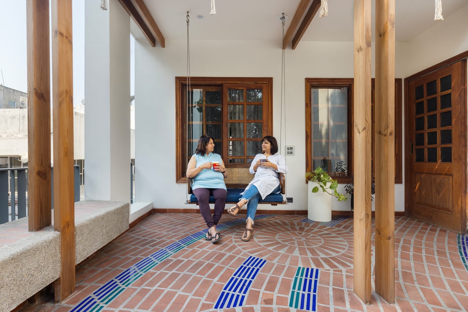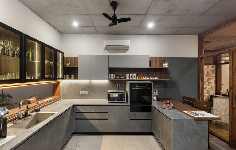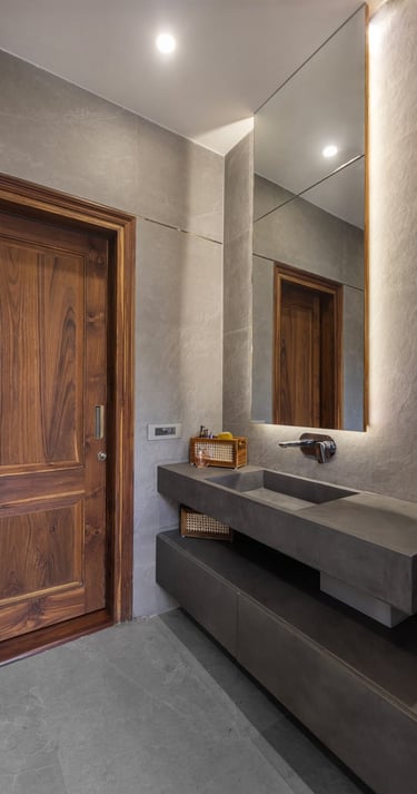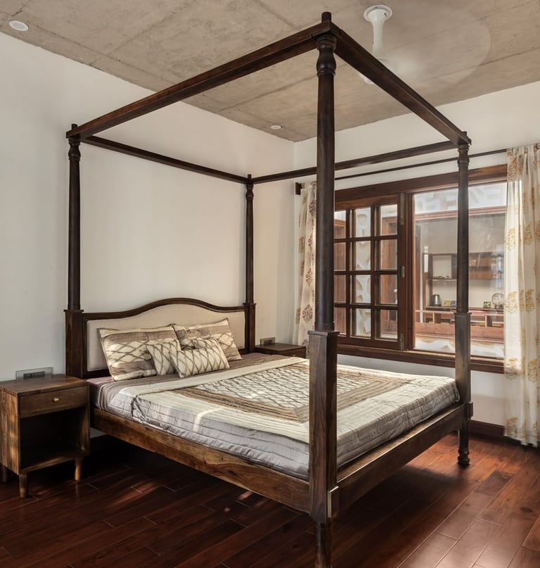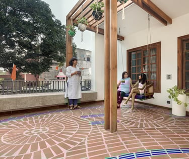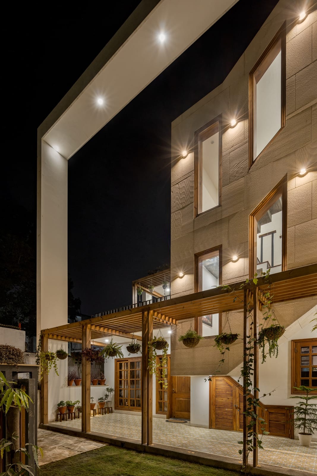 Designed as a serene retreat for septuagenarians, the home embraces earthy materials like wood, stone, jute and rattan, offering warmth and timeless elegance.