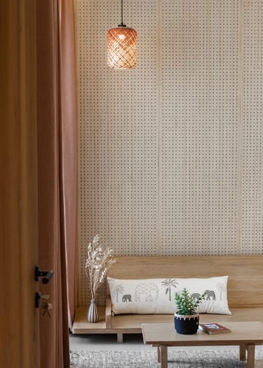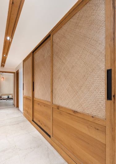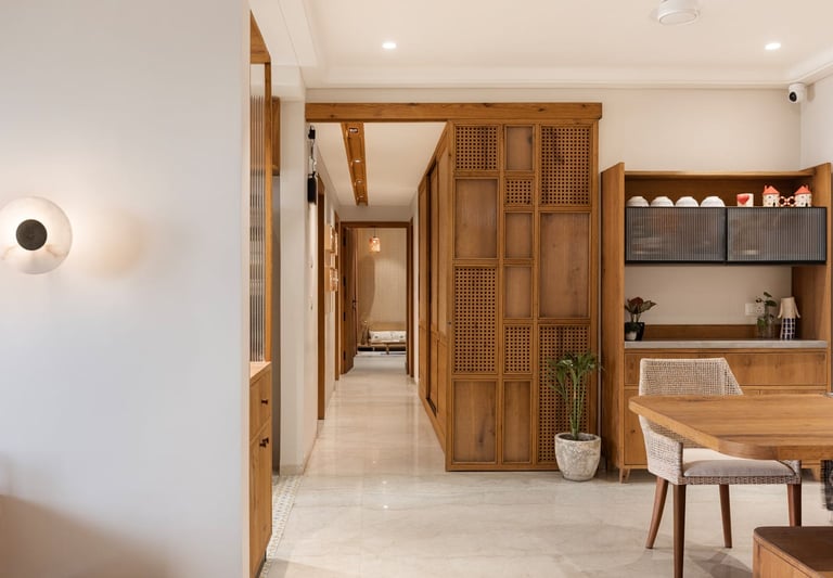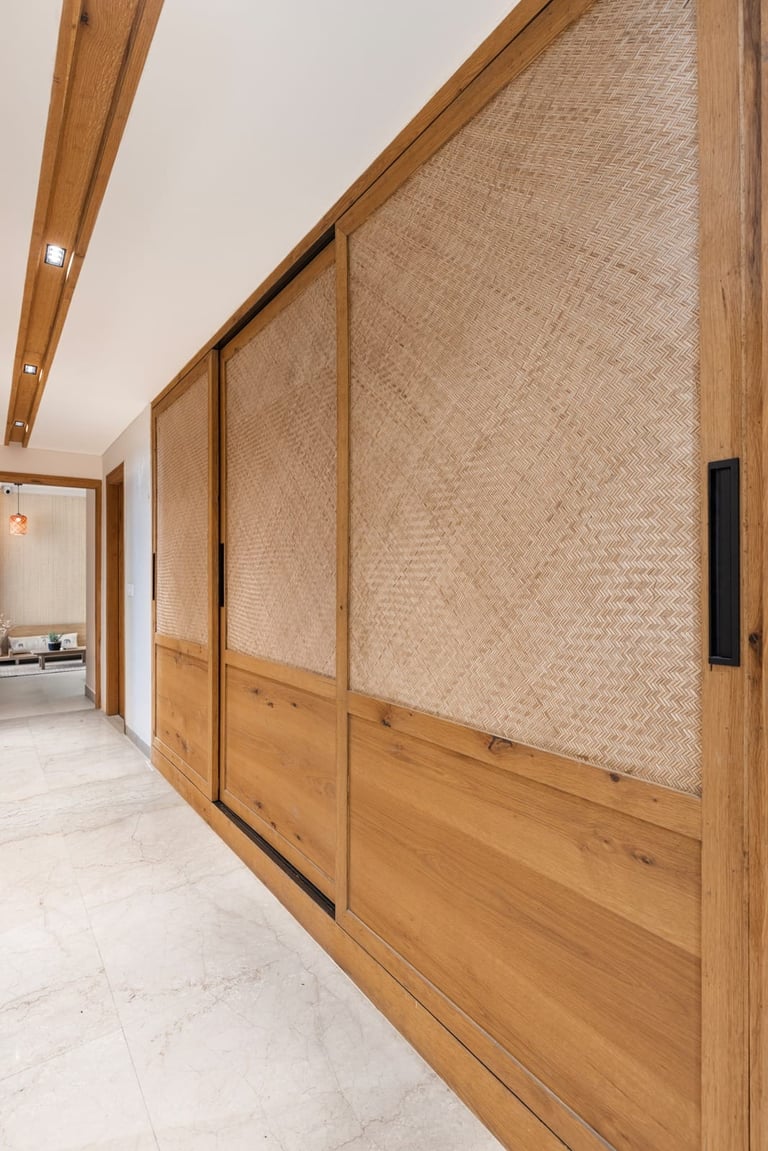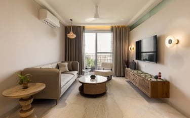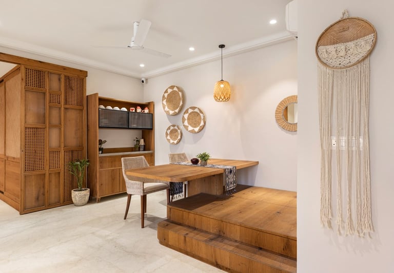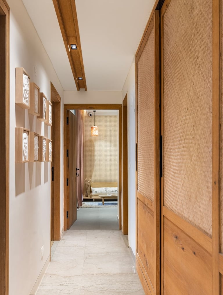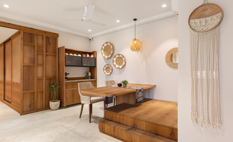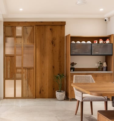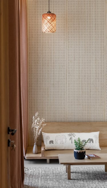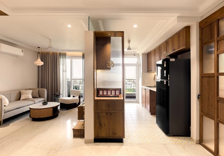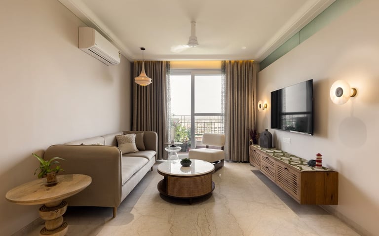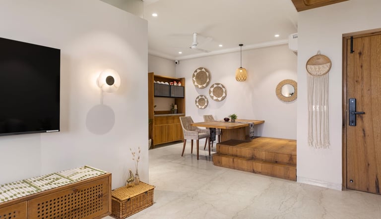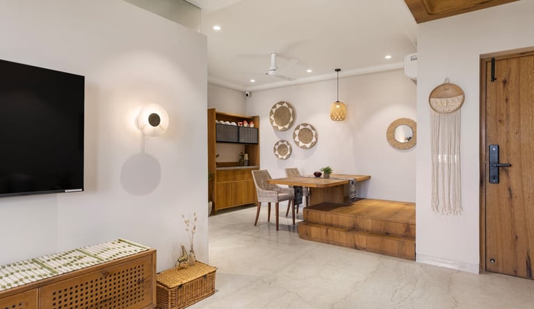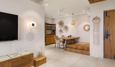 Apartment Kanso is situated in Mohali, Punjab, embodies the journey from a standard apartment to a warm, personalized home. This project draws inspiration from calm minimalism and earthy colour tones, integrating natural textures like rattan, cane, and wood with soft beige and off-white hues to create a serene, clutter-free environment.