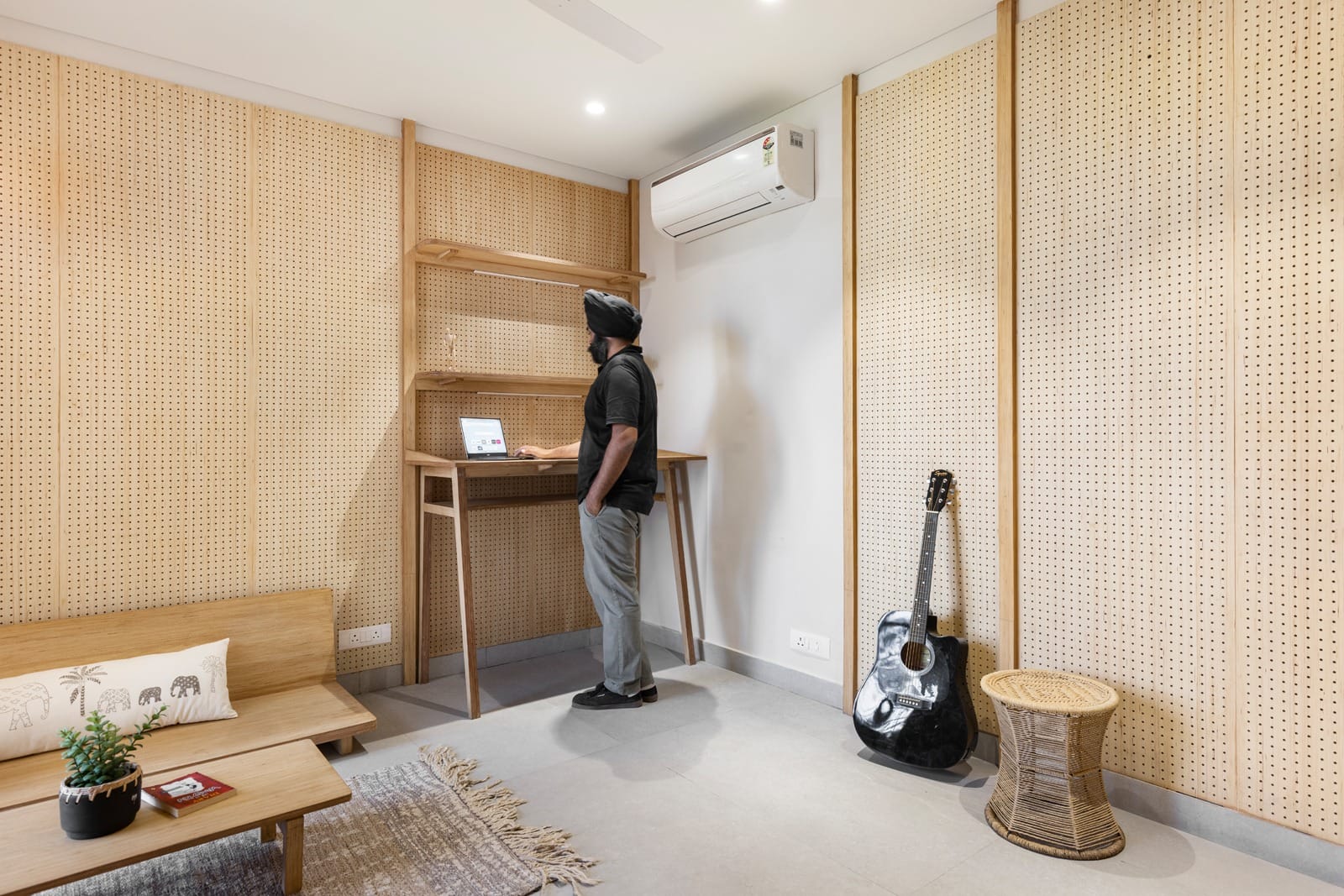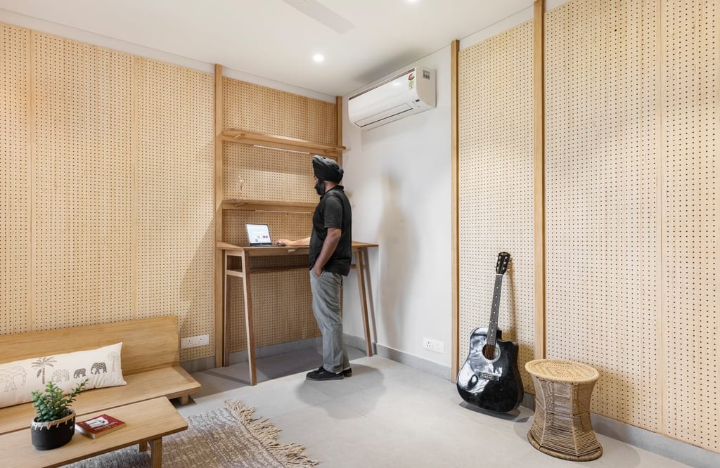 Clean lines, muted palettes, and a thoughtful emphasis on light and functionality reflect a refined balance between form and purpose. To create a breathing space, perforations have been strategically placed throughout the house. Breathability provides a light-spreading effect in addition to ventilation.